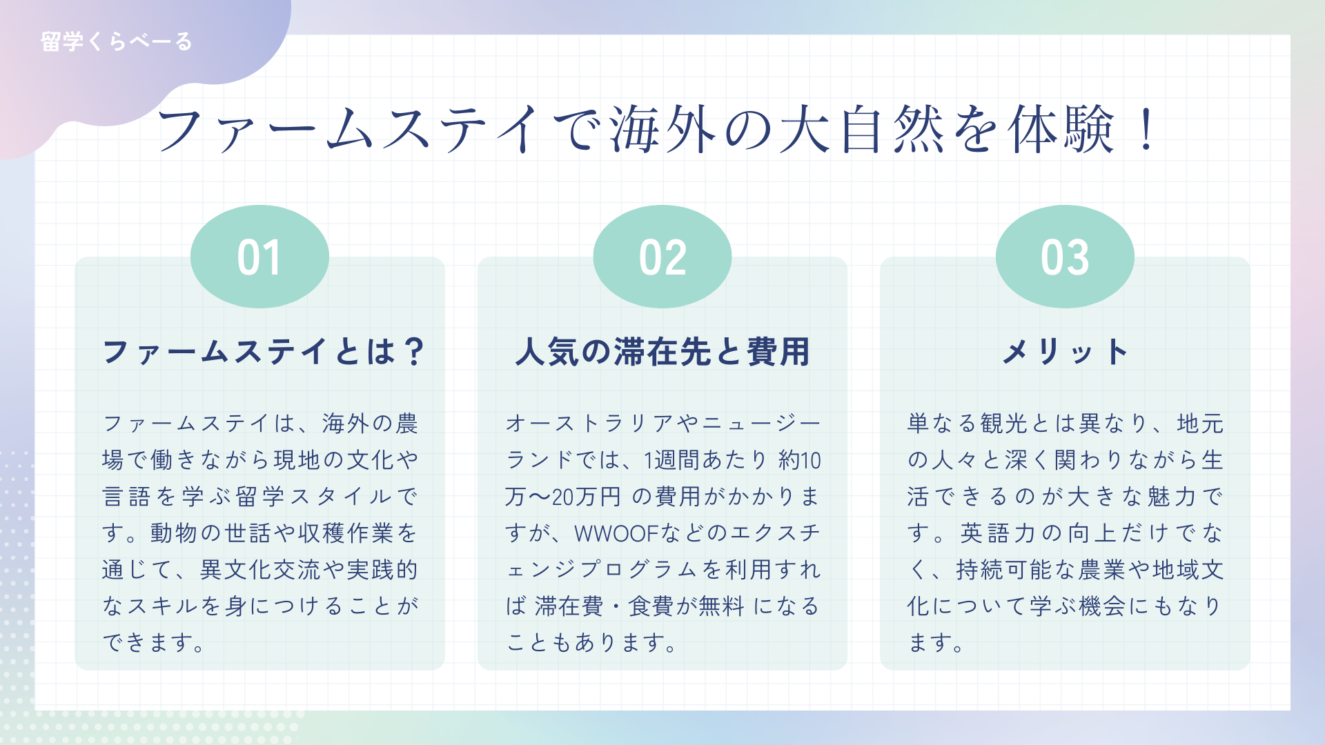 また、労働を目的としたファームでは費用を抑えて海外での生活を経験できるので、自分の目的に合わせてファームステイの計画を立ててみてくださいね♪